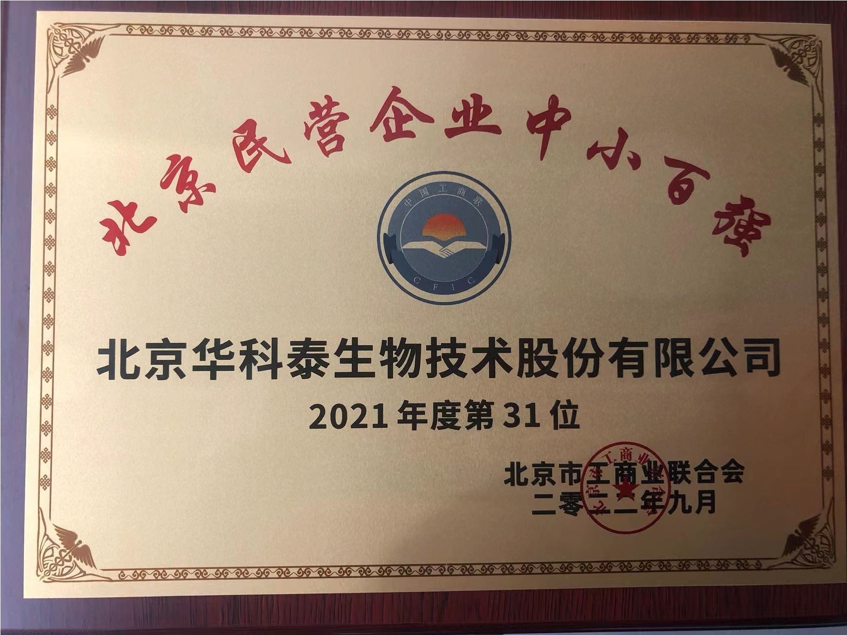 北京市民营企业中小百强2021年度第31位